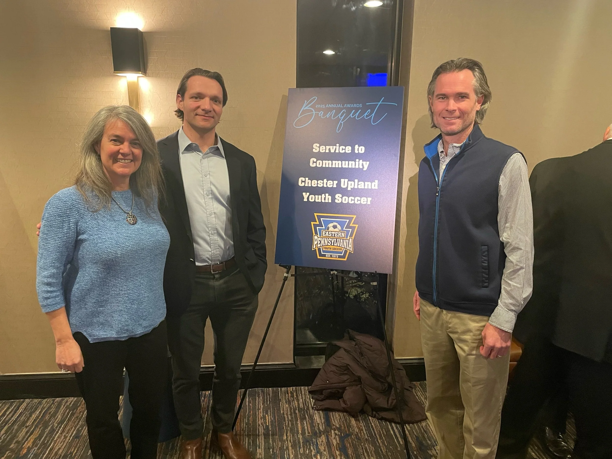Jeannine Anckaitis (L) and Brent Jacquette (R), pictured with Board Member Erich Yost prior to accepting a community service award from Eastern PA Youth Soccer in February 2025.